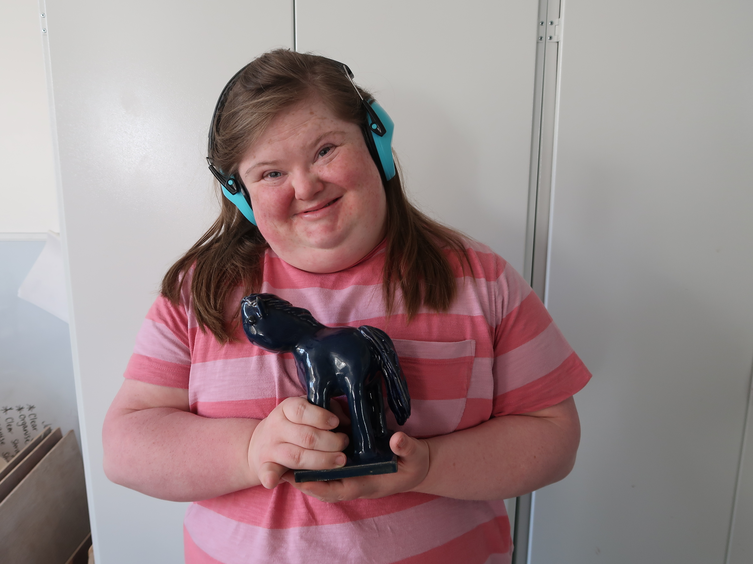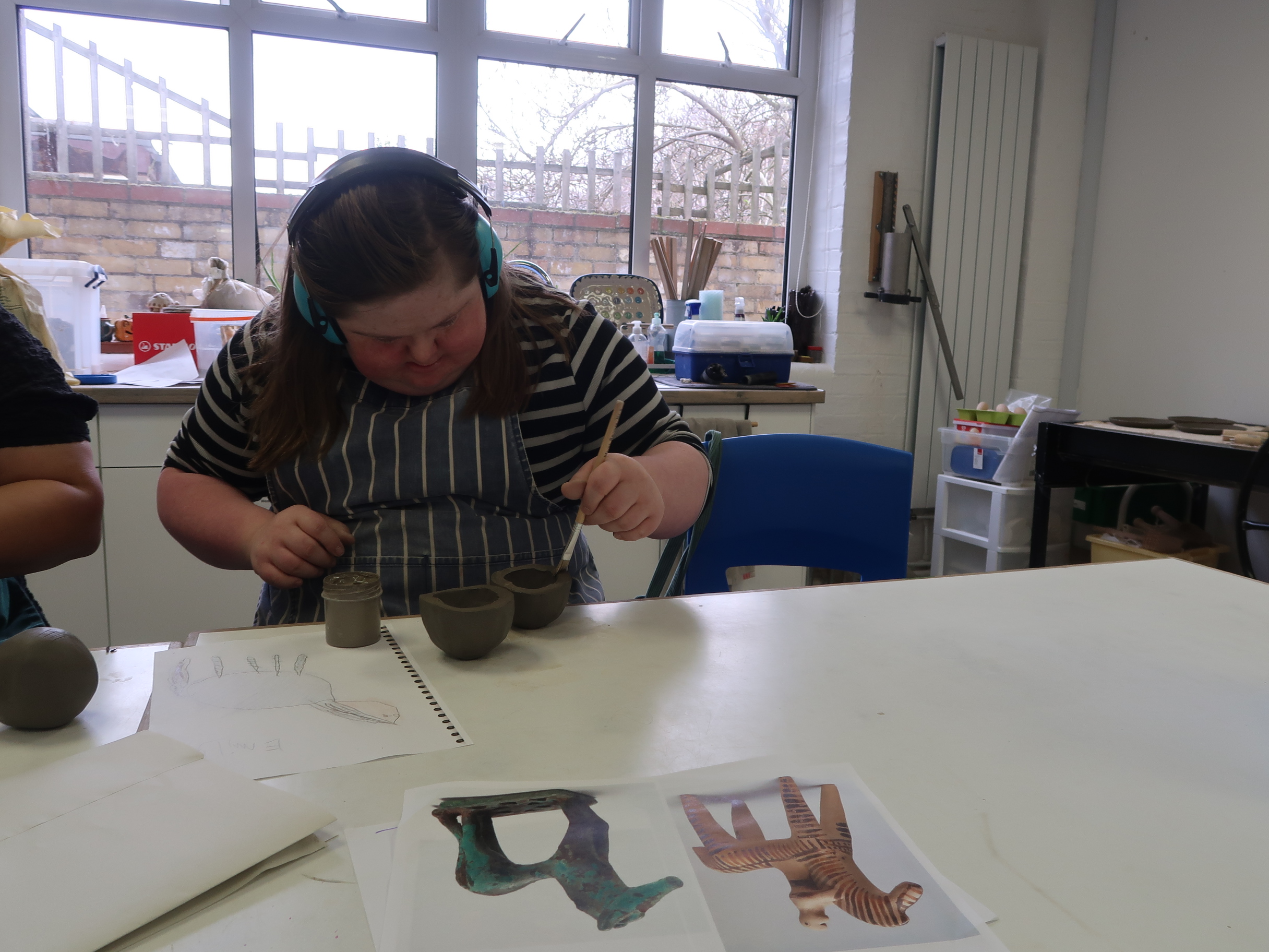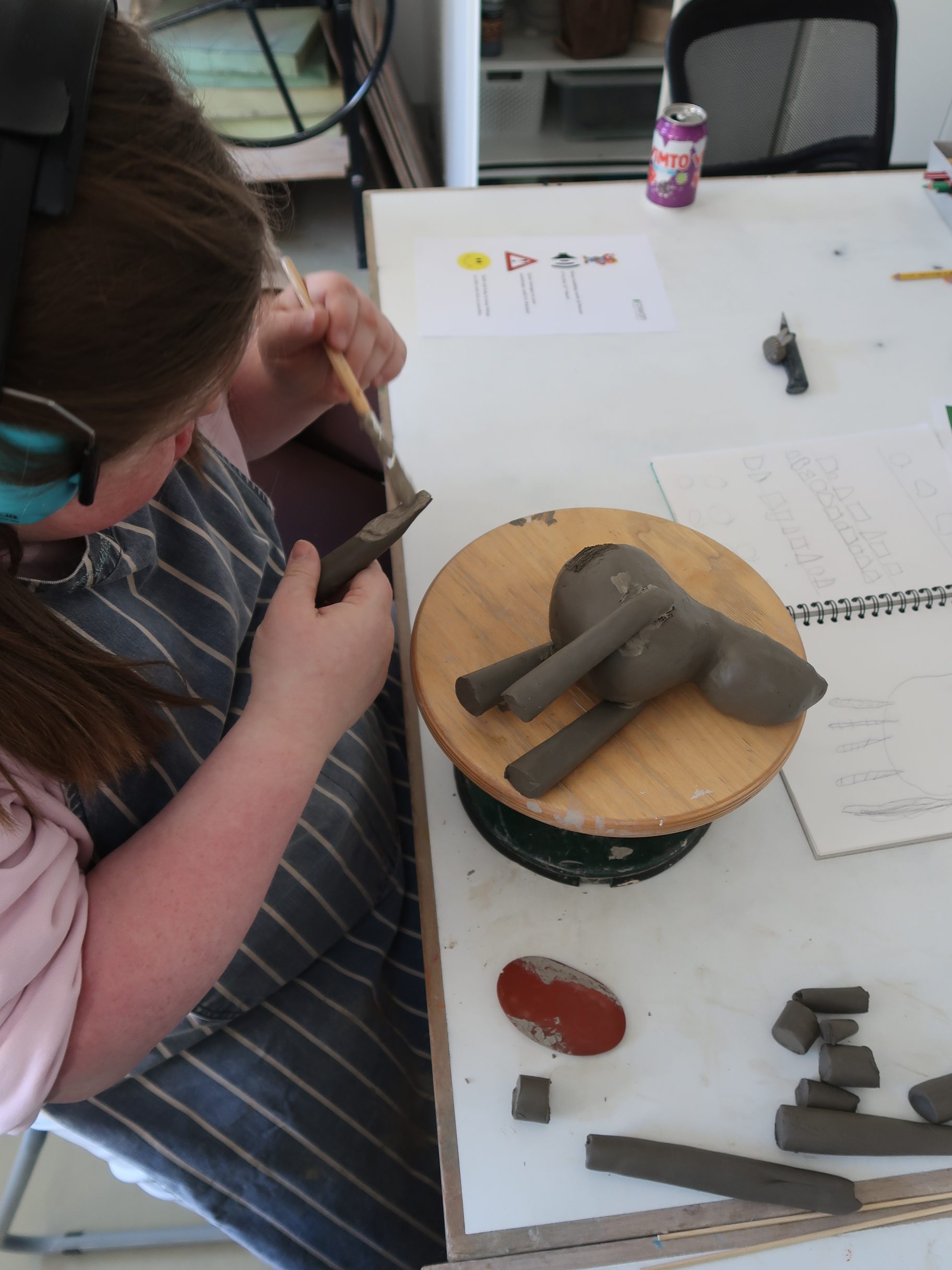Emily has been attending Rowan for around two years, joining us three times each week. She enjoys painting and immersing herself in clay projects every Friday. Recently, Emily has been focusing on a heartfelt project for her brother. I had the wonderful opportunity to enter the ceramics room and chat with Emily about her latest creation – Duncan!